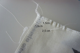 耳から直角になるよう、正確に測って裁断したら、布端にロックミシンかジグザグをかけておきます。